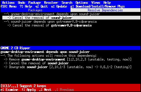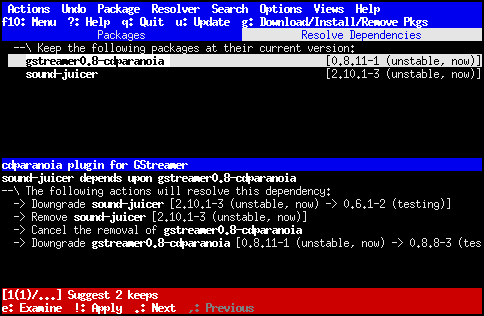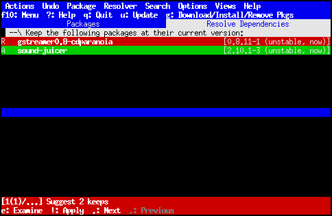 Pokud se vyskytne problém se závislostmi, aptitude vám může pomoci v jeho řešení. Okamžitě po výskytu problému se dole na obrazovce objeví červený pruh, ve kterém aptitude stručně shrnuje navrhované změny. Například na následujícím obrázku aptitude naznačuje, že by mohla situaci vyřešit ponecháním dvou balíků ve stávajících verzích.